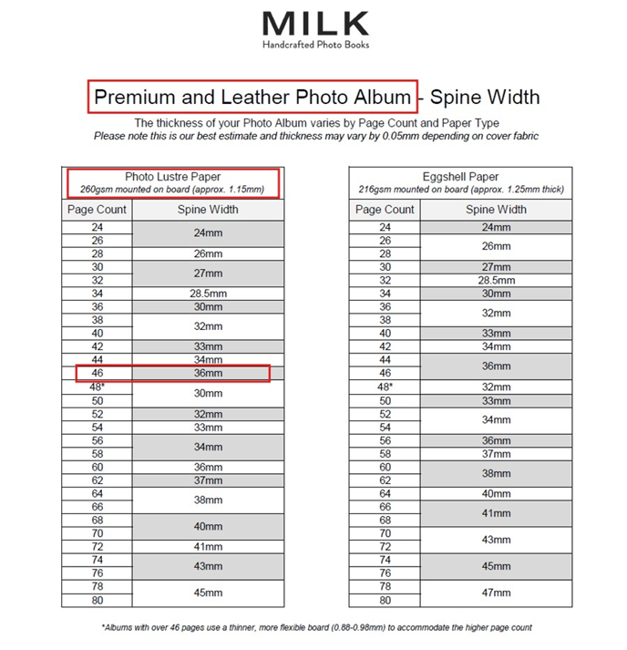 You can see an example of finding the spine width for a 46-page Premium Photo Album with Photo Lustre paper below: